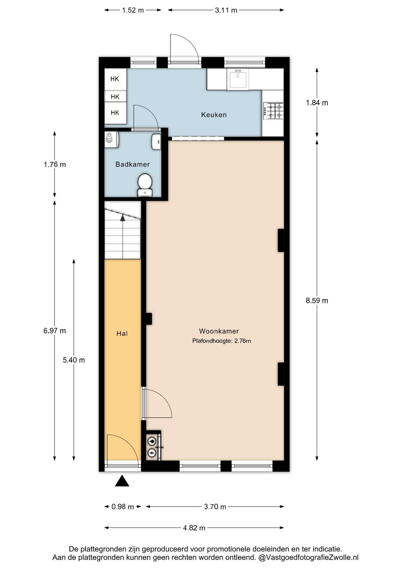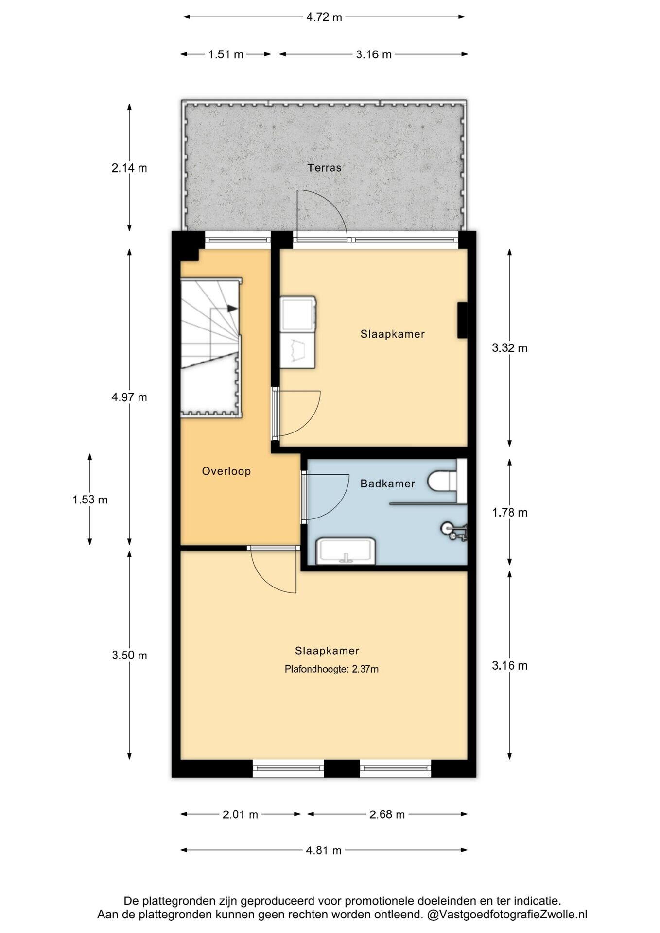 - 48 m² (9,50 meter diep en 5,00 meter breed)